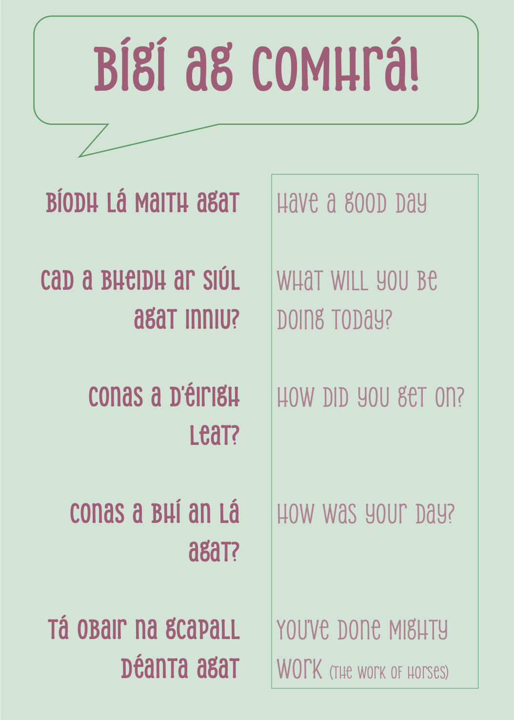 Bí ag comhrá Gaeilge led’leanbh ar maidin agus tar éis scoile, le cairde nó clann! Tá cúpla abairt áisiúil ag Rang a 4. Agus éistigí siar ar na taifid a déanadh roimh seo ag an gcnaipe thuas.