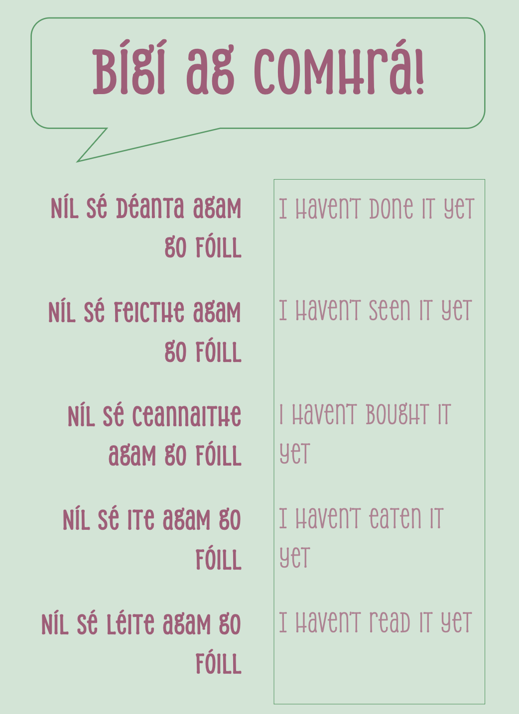 Tá go leor rudaí déanta ag Rang a 6 gan dabht, ach tá cúpla rud nach bhfuil déanta acu go fóill. Éistigí leo agus beidh tusa in ann a rá as Gaeilge nuair nach bhfuil rud déanta agatsa ‘go fóill’.
