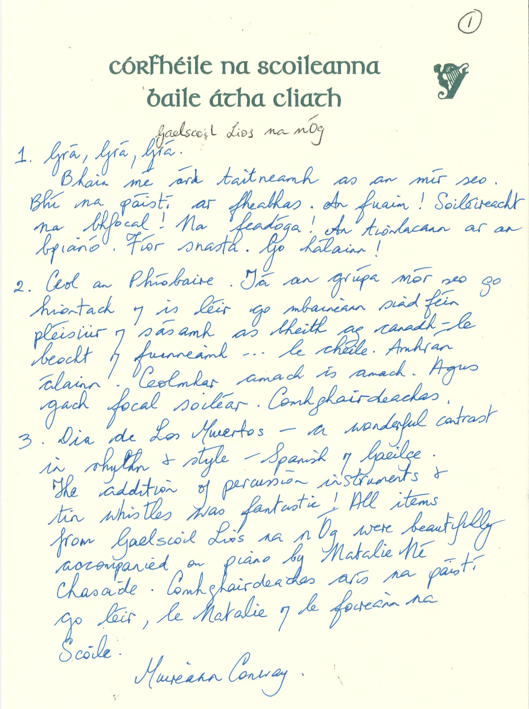 Comhghairdeas ollmhór le leanaí na scoile, a fuair ardmholadh ag an gCórfhéile i rith na sceachtaine. Ba léir gur bhaineadar féin agus an lucht féachana an-taitneamh as an gcur i láthair. Múinteoir Natalie a thionlaic ar an bpianó, agus a chum Dia de Los Muertos, agus Múinteoir Caitlín a stiúir. Maith sibh gach duine!
