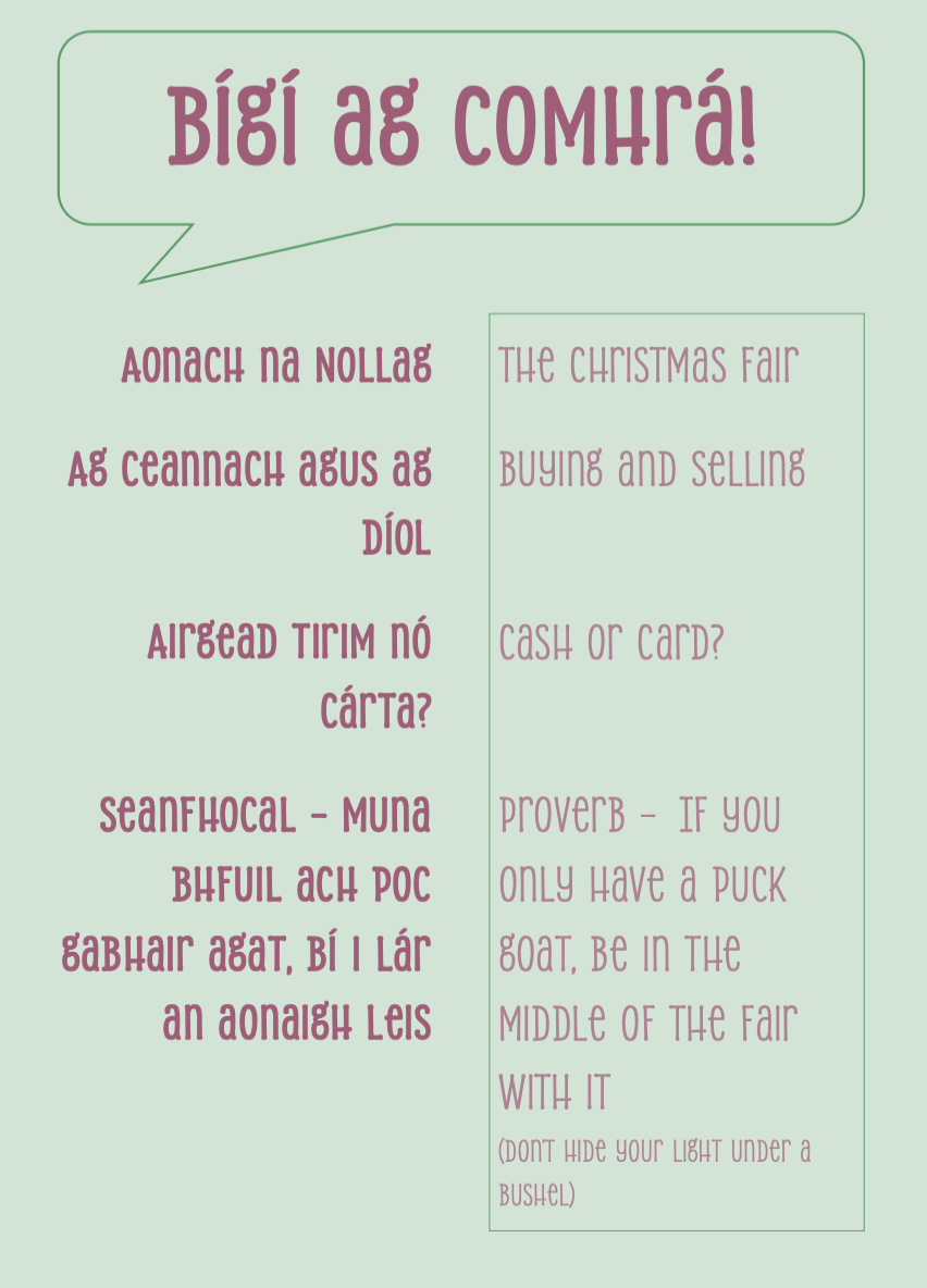 This weekend is a big occasion in the schoolyear, the Aonach. Rang a 4 have a couple of handy phrases. Previous recordings are available at the ‘Bígí ag comhrá’ tab above.
