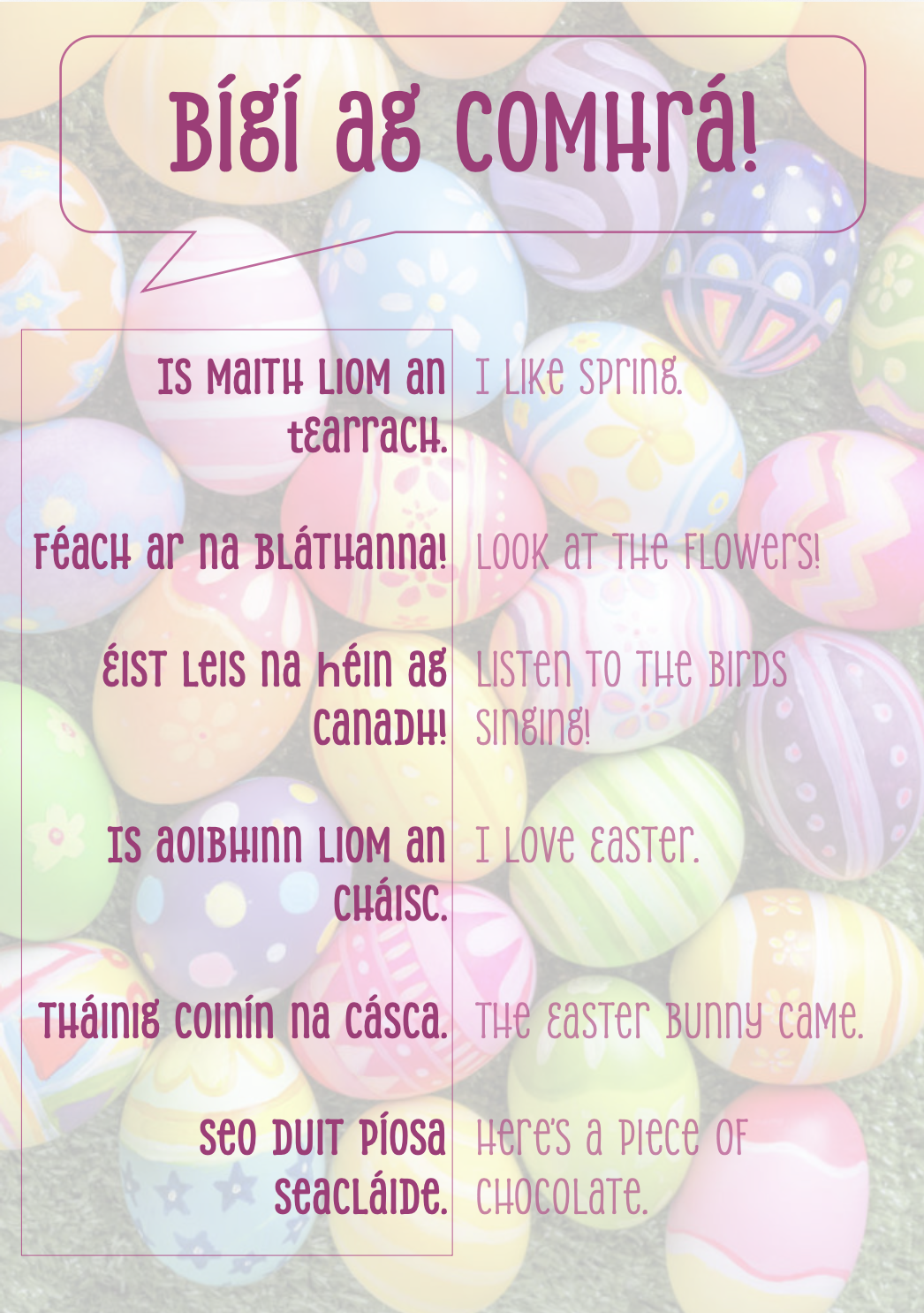 Seo daoibh Rang a 1 le cúpla frása atá in oiriúint don séasúr, agus nach iontach iad. Leanaigí a ndea-shampla agus bígí ag caint as Gaeilge thar an gCáisc!