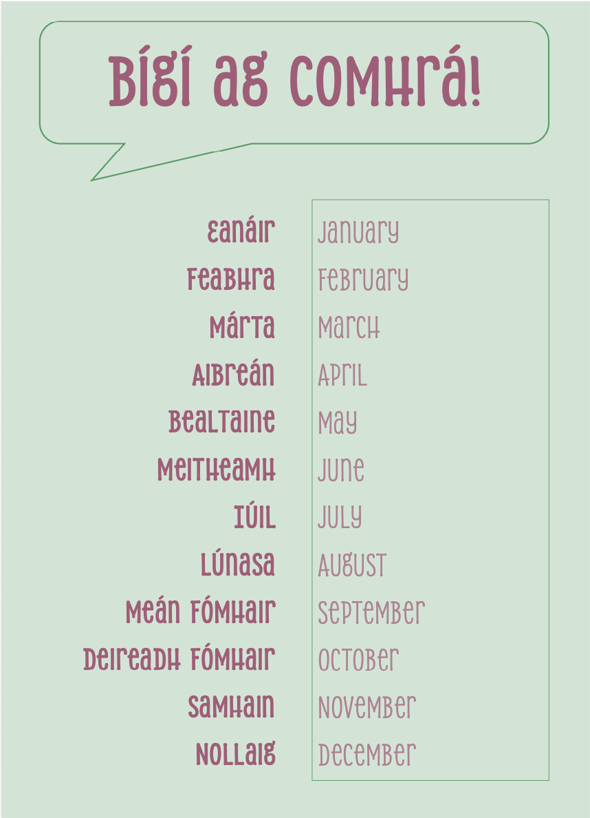 Tús na bliana atá ann agus níl aon rud níos oiriúnaí mar théama ná míonna na bliana agus na séasúir. Rang a 2 atá ann an tseachtain seo agus bígí cinnte go mbeidh ceol ann chomh maith!